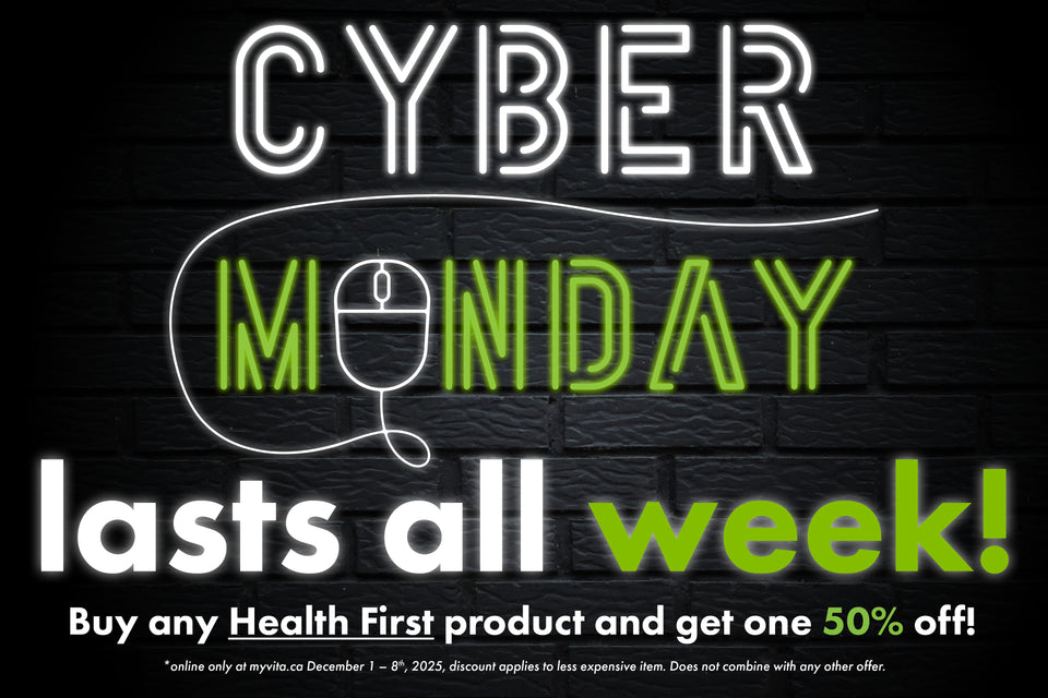 Buy any Health First product and get one 50% off!** No quantity limits. Offer available at myvita.ca only from December 1-8th, 2025, don't miss out!