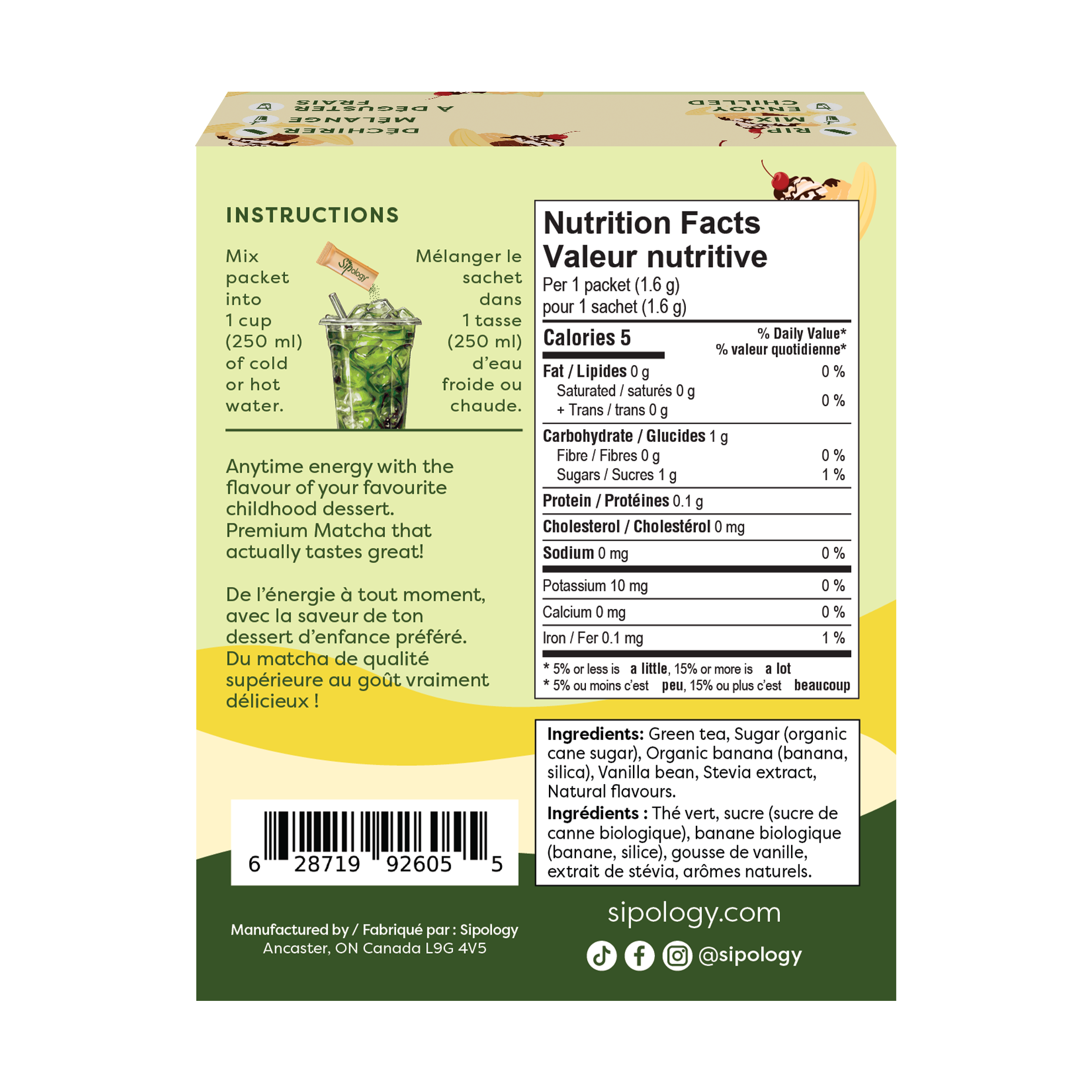 Ingredients: Green tea, Sugar (organic cane sugar), Organic banana powder (banana powder, silica), Vanilla bean powder, Organic stevia extract, Natural flavours.