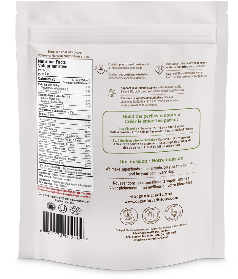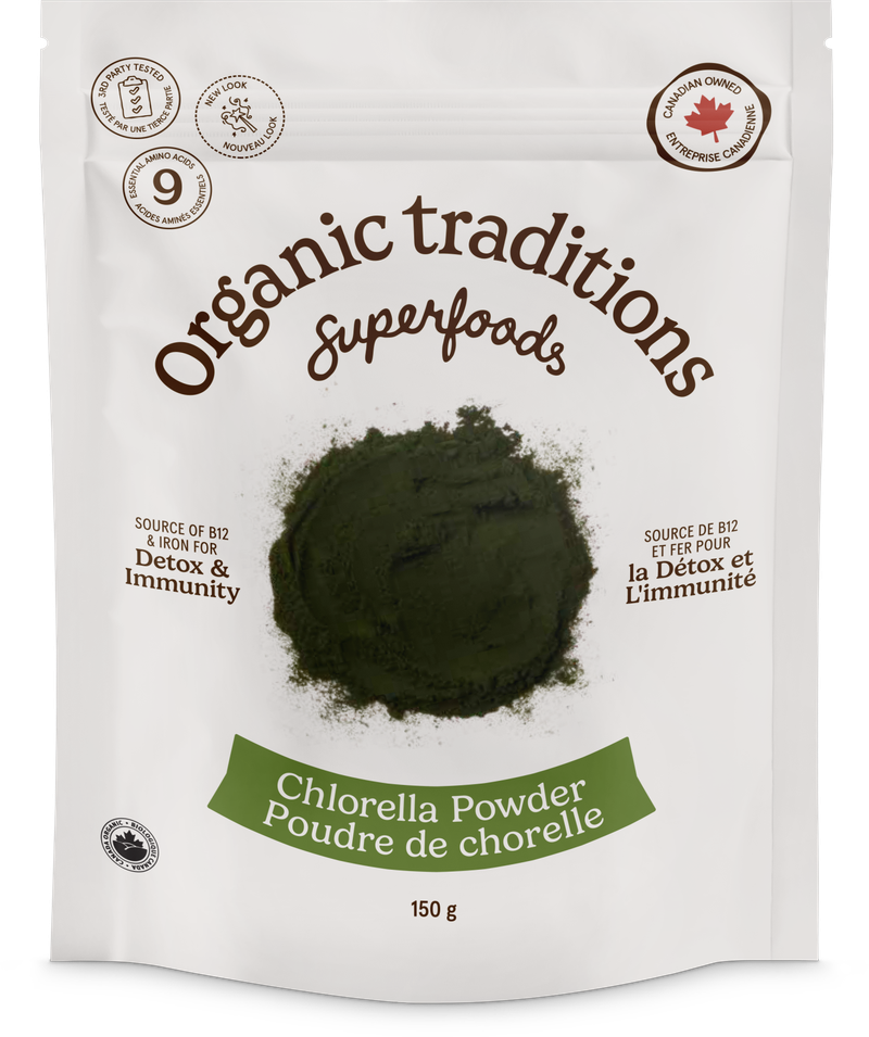 Chlorella is a fresh water green algae. It is an excellent source of vitamin A, vitamin B12 and iron as well as a host of other nutrients. Organic Traditions Chlorella Powder is a raw and kosher broken cell wall powder with no fillers,preservatives or additives. Start with ½-1 tsp. of powder and build gradually. Consume 1-4 teaspoons daily. Add chlorella to water,smoothies, yogurt and delicious raw food desserts.