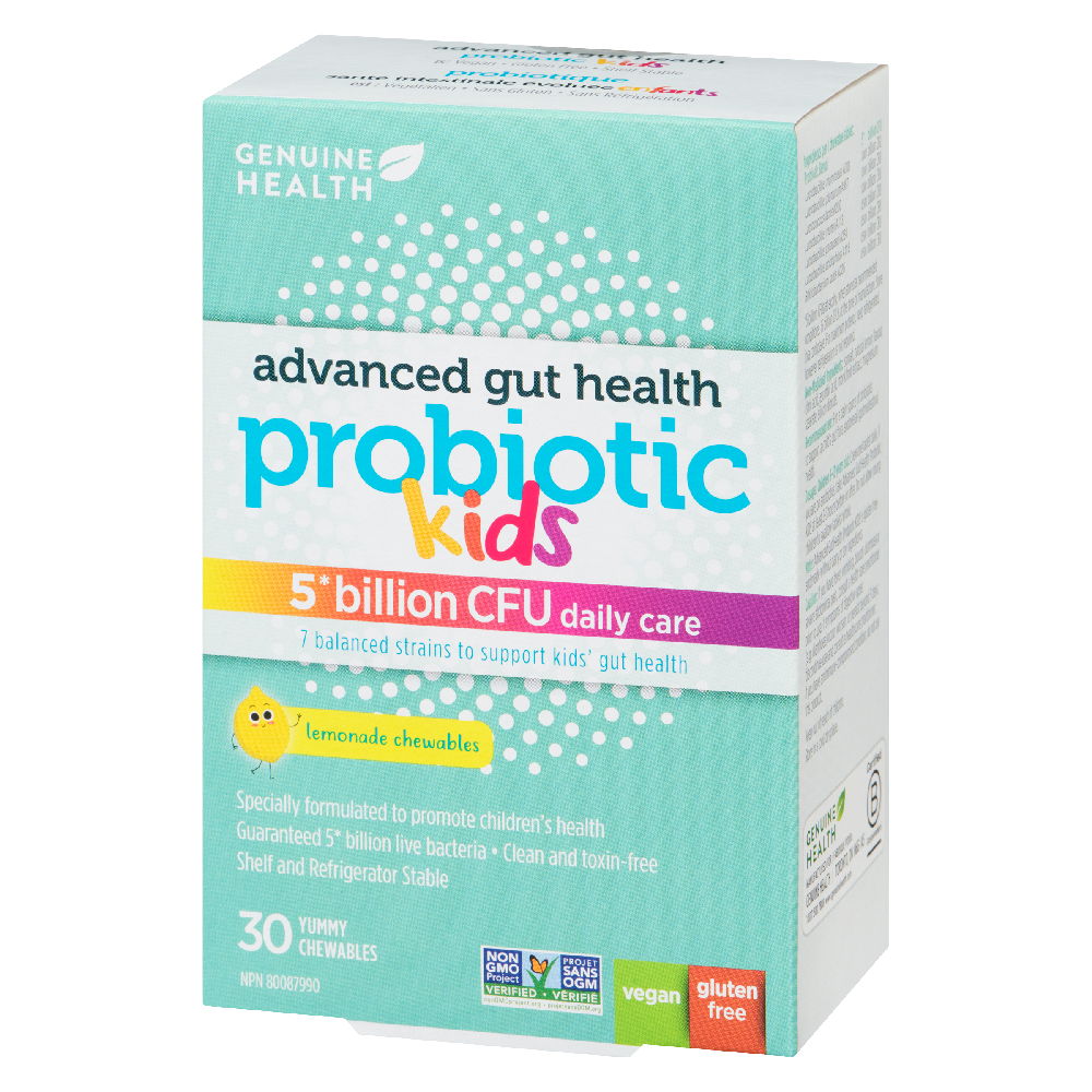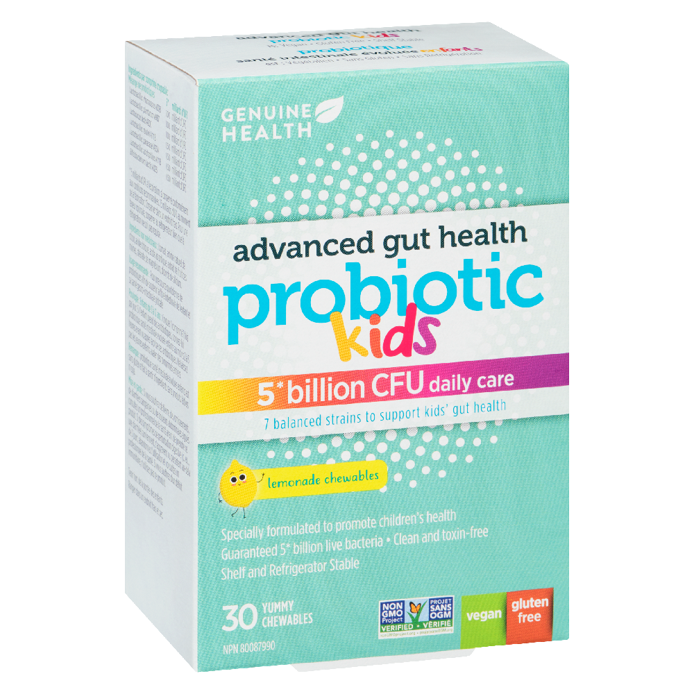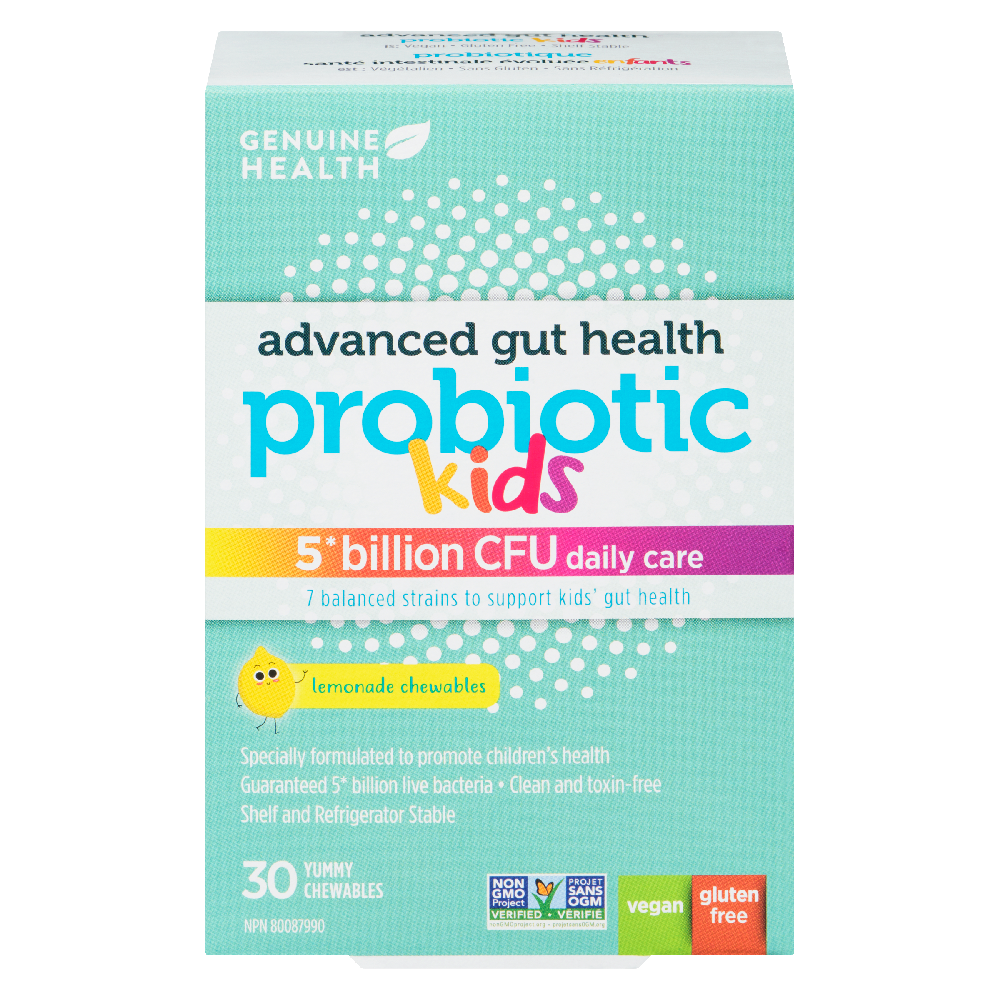 Genuine Health Kids Probiotic 30s supports healthy digestion in children with a kid friendly probiotic blend. It delivers 5 billion CFU across seven balanced strains in a lemon flavored chewable and comes in a 30 count box. 5 Billion CFU Daily Care: provides a daily dose of 5 billion CFU to help maintain gut balance. Seven Balanced Strains: a diverse mix designed to support multiple gut functions while remaining gentle for young tummies. Lemonade Flavored Chewables: kid friendly lemon taste that makes daily use enjoyable. Vegan: plant based formulation aligning with vegan lifestyles. Gluten Free: suitable for gluten sensitive individuals. Non GMO Project Verified: verified free from genetically modified organisms. Shelf and Refrigerator Stable: flexible storage options for busy families. Kid Focused Formula: specially designed for children with gentle strains and child friendly dosing. By supporting a balanced gut microbiome, this probiotic helps promote regular digestion and everyday wellness for active kids. The tasty chewable format makes consistent use simple for busy families, and the compact box travels easily for school days and trips. The formula is designed to release in the gut for maximum benefit and is suitable for children three years and older. Recommended Use Chew one chewable daily for children three years and older. Chew thoroughly before swallowing. Store in a cool dry place. If your child has allergies or is taking other medications, consult a healthcare professional before use.
