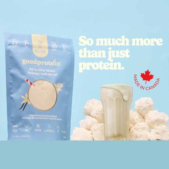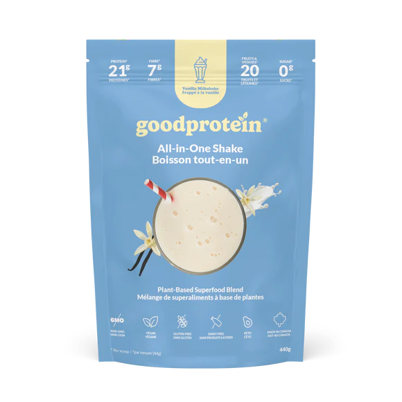 Protein blend (pea protein, milled golden flaxseed), Natural flavours, Soluble tapioca fibers, Coconut milk powder* (coconut milk powder*, tapioca maltodextrin*, acacia gum*), Medium chain triglycerides (medium chain triglycerides from coconut oil, tapioca maltodextrin), Acacia gum, Guar gum, Xanthan gum, Fruits, vegetables and mushrooms blend (spinach, broccoli, carrot, sweet potato, orange, apple, strawberry, sunflower seed, shiitake mushroom, maitake mushroom, pomegranate juice powder*, acai juice powder*, goji juice powder*, grape juice powder*, amla fruit powder*, cranberry powder*, aronia powder*, sea buckthorn juice powder*, camu camu powder*, acerola juice powder*), Rebaudioside M, Salt, Bacterial culture and enzymes blend (rice maltodextrin, Bacillus subtilis, bromelain, papain). *Organic ingredients
