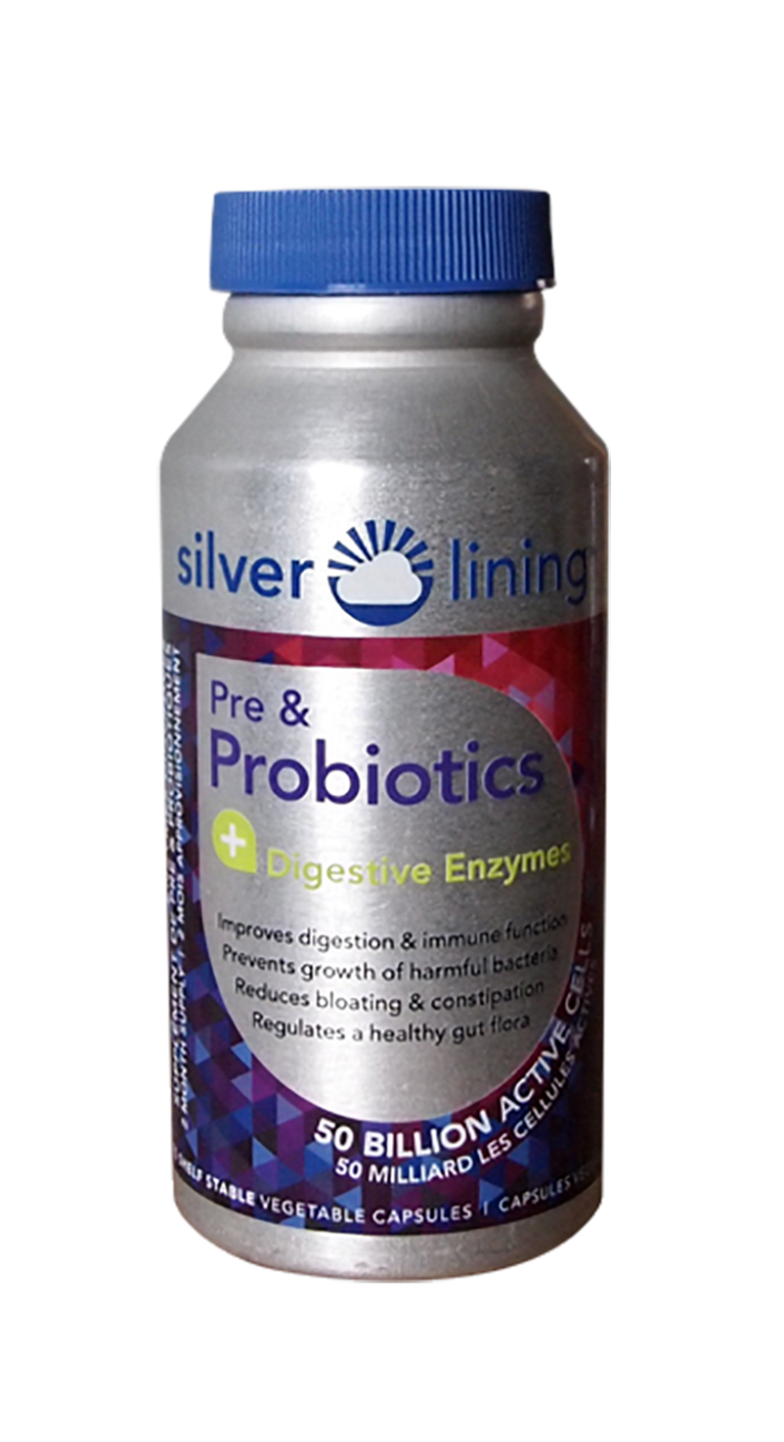 Silver Lining is a unique digestive blend of prebiotic, probiotics and digestive enzymes promoting a favourable gut flora and maintenance of good health through intestinal and gastro-intestinal support.We eat on the go, chewing too fast and too little. For many, mineral and vitamin consumption is low and the foods we eat have been highly processed, hampering our body's ability to maintain a healthy gut flora. With high stress levels and the overuse of antibiotics and painkillers, harmful bacteria can quickly take over.Adding Silver Lining to your daily routine will help you properly digest your food, breaking down and eliminating waste, while at the same time building up the healthy microorganisms needed to maintain, fortify and protect your overall health and well-being.FEATURESContains 50 billion active cellsShelf stable (no refrigeration necessary)No artificial colours, flavours or preservativesNo sugar, salt, starch or glutenWe adhere to our high standards of quality control. You can be sure that every bottle of Silver Lining has been thoroughly inspected.INGREDIENTSLactobacillus acidophilus, Lactobacillus casei, Bifidobacterium bifidum, Pediococcus acidilacti, Amylase, Cellulase, Lipase, Protease, Whey.