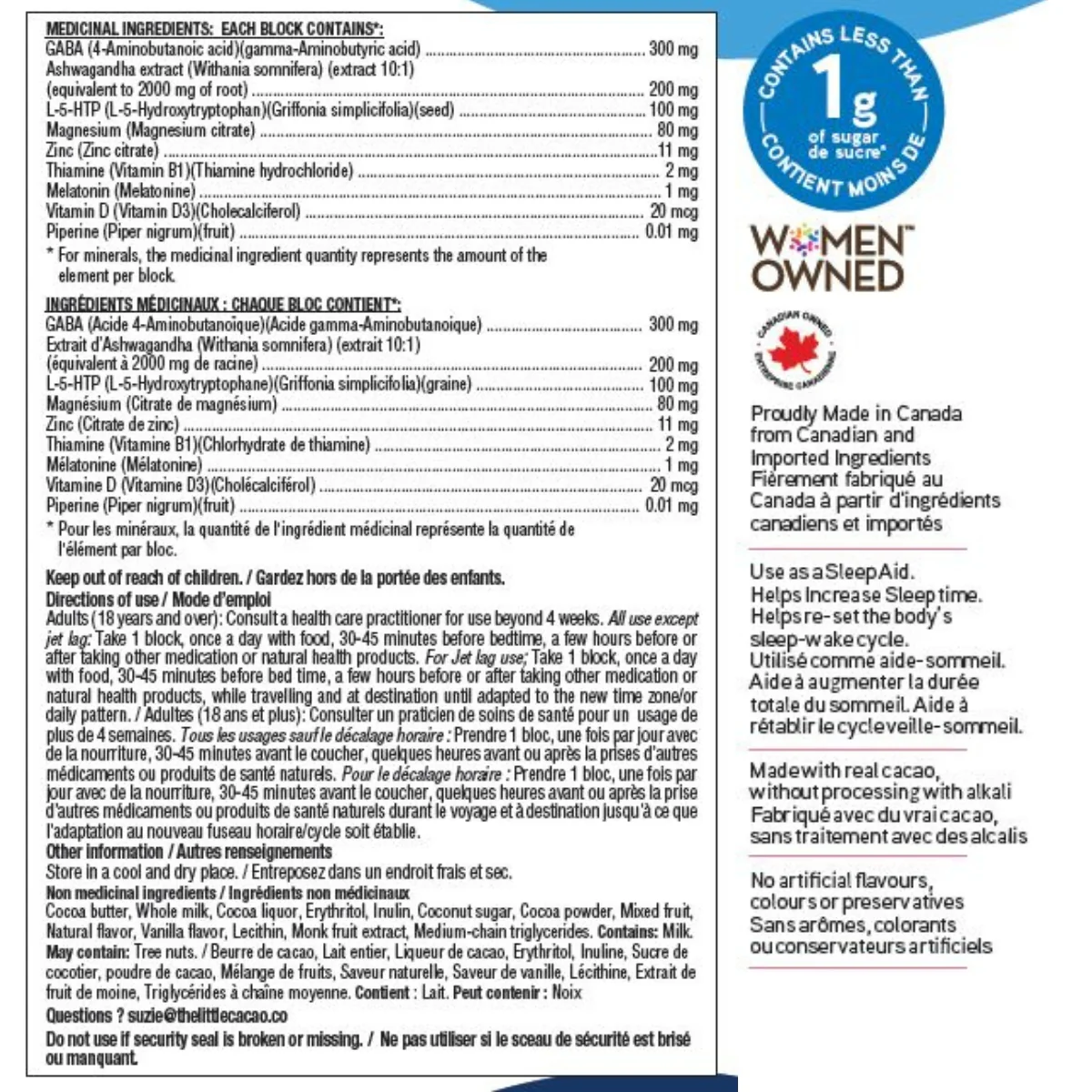 Non medicinal ingredients: Cocoa butter, Whole milk, Cocoa liquor, Erythritol, Inulin, Coconut sugar, Cocoa powder, Mixed fruit, Natural flavor, Vanilla flavor, Lecithin, Monk fruit extract, Medium-chain triglycerides. Contains: Milk. May contain: Tree nuts.