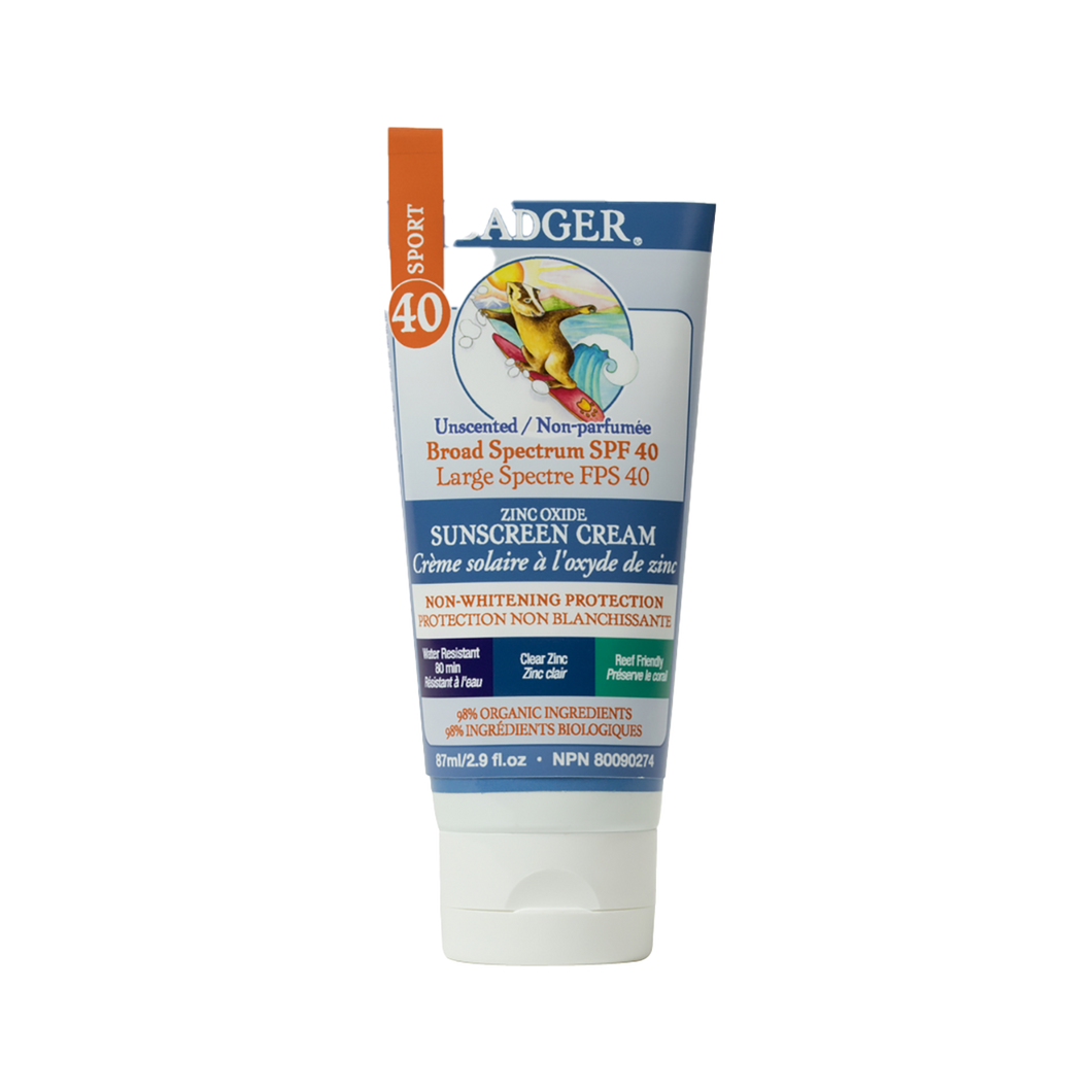 - Badger's SPF 35 Clear Zinc Oxide Sunscreen rubs in clear, is easy to apply, and blends with any skin tone. This sport sunscreen provides water-resistant broad spectrum protection in a gentle, antioxidant-rich, moisturizing Sunflower Oil base. No added fragrance and hypoallergenic so it's safe for even the most sensitive skin. It's also biodegradable and coral reef safe.